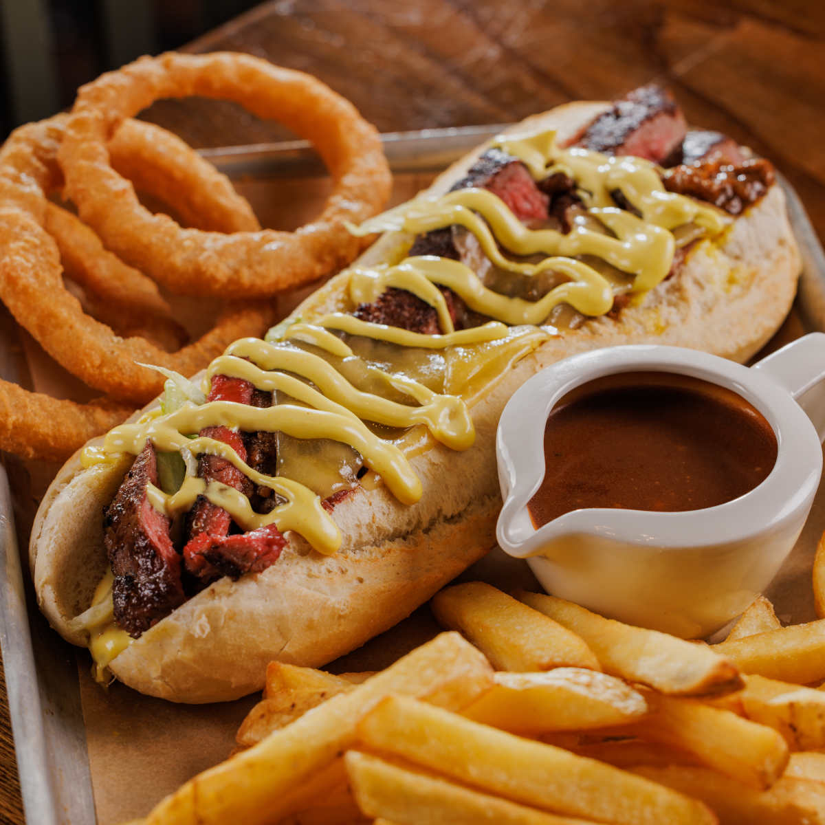 Ultimate steak dipper, steak, melted cheese and rich beef gravy in a crusty baguette, with crispy onion rings, chips and a pot of gravy for dipping | 14.29 1886 kcals